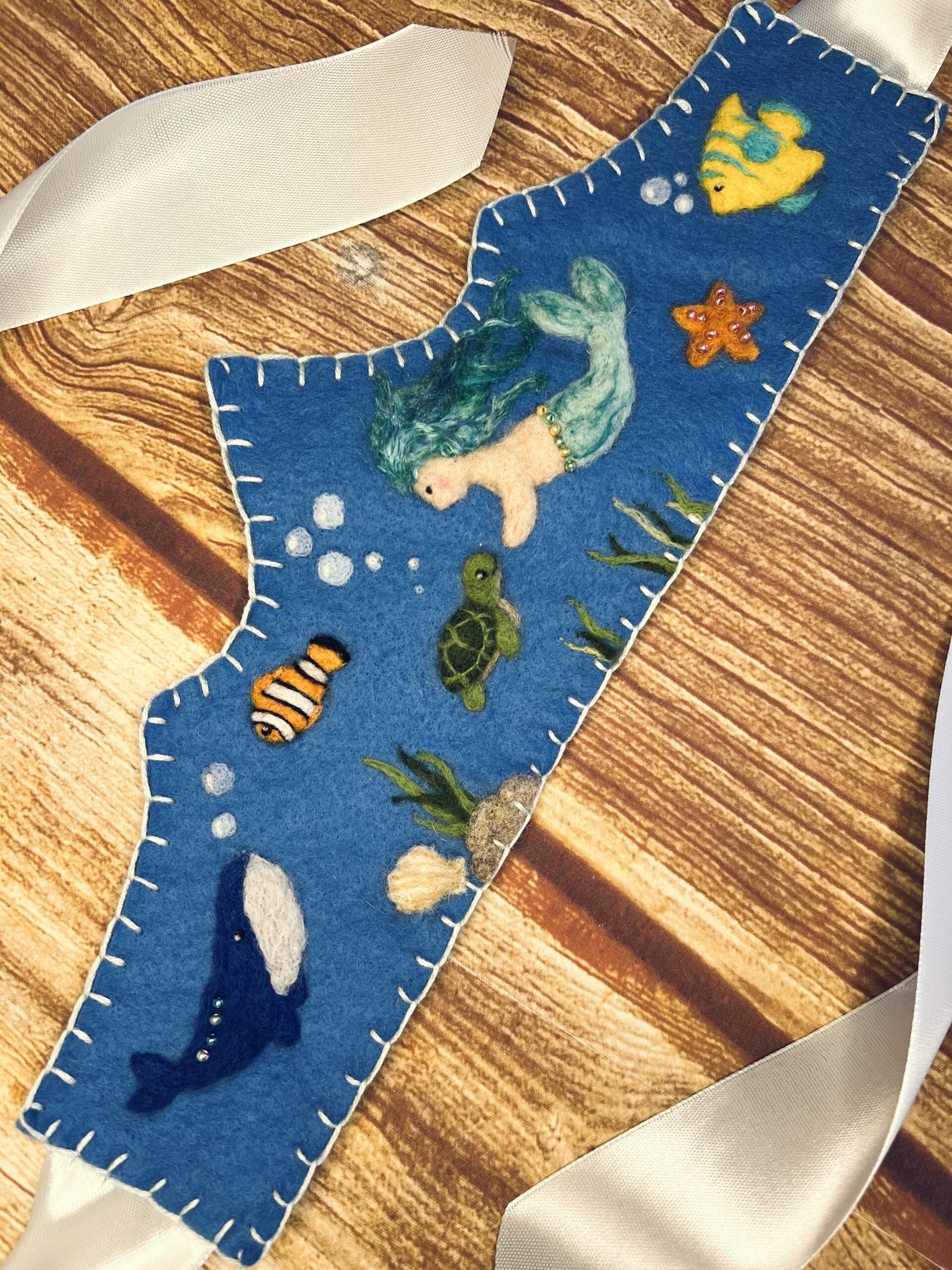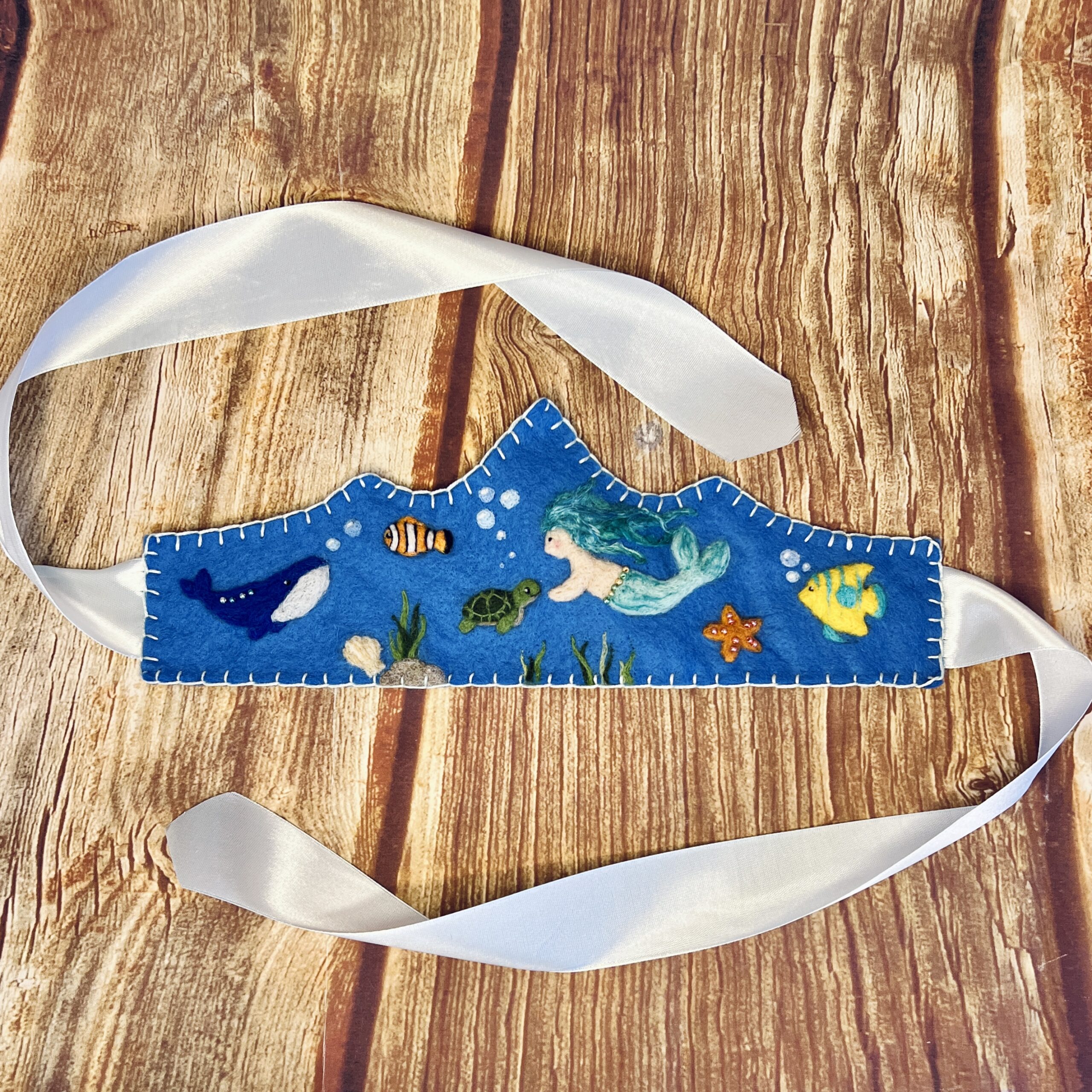Diese handgefertigte Filzkrone lädt Kinder dazu ein, in eine zauberhafte Meereswelt einzutauchen. Liebevoll aus hochwertigem Wollfilz gefertigt mit detailreich gestalteten Meeresbewohnern – von der kleinen Meerjungfrau bis hin zu Fischen, Seestern und Schildkröte.